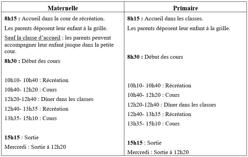 L’école commence à 8h30. Tout retard devra être justifié par un mot d’absence valable que la direction se réserve le droit d’accepter ou non. Des retards répétitifs à ce temps de rassemblement nuiraient au bien être de votre enfant, de sa classe et de son titulaire. Il vous sera demandé de nous indiquer clairement les raisons de votre retard au parlophone. En cas de retards répétés, la direction contactera les parents.